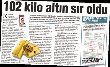 Kanada’dan yaklaşık 6 ay önce yola çıkan ve Kanada- Türkiye hattında kaybolan 102 kilo altınla ilgili sır perdesi hâlâ kaldırılamadı. Kanada merkezli petrol, rafineri, altın ve danışmanlık şirketi Cardinal Holding’e ait 20 milyon dolarlık altın, Kanada- Türkiye hattında kayıplara karıştı. Cardinal Holding, taşıyıcı firma ADE Global Nakliyat’ı suçlarken, nakliyat şirketi ise bu şirketin altınlarını hiç taşımadığını savunuyor. Konu Gümrük ve Ticaret Bakanlığı’na kadar taşınırken, Cardinal Holding savcılığa suç duyurusunda bulundu. Suç duyurusunun, hazırlık tahkikatı aşamasında olduğu bildirildi.