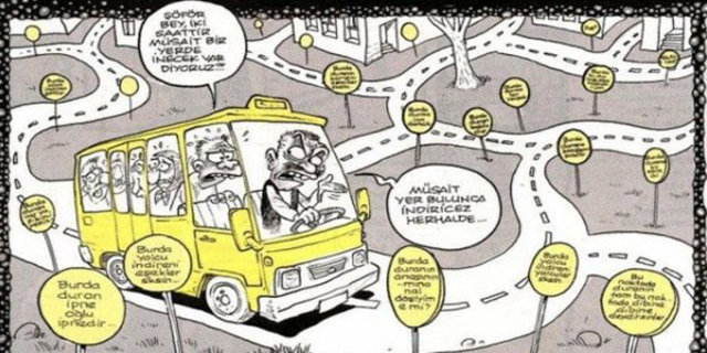 "Müsait bir yerde inecek var" gibi bir durma eylemi ancak bu kadar şoförün inisiyatifine bırakılabilinir... Maksat giden aracı durdurmak değil mi? "İnecek var" de durur zaten. "Müsait bir yer..." dediğin her an ineceğin yerden kafadan bir kilometre uzaklaşıyorsun demektir. Çünkü şoförler yapı itibariyle rahat insan olduklarından müsait bir yer denildiğinde akıllarına genelde mesire yerleri gelmektedir. Müsait bir yerde inmek isterken yeni yerler keşfedebilirsiniz. - 24