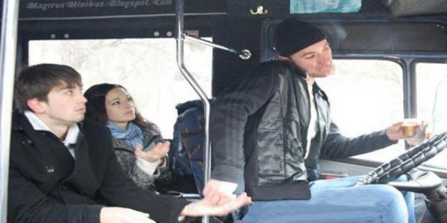 Minibüslerde en öne oturanın da dramı bir başkadır. Nedendir bilinmez o koltuğa az biraz minibüsçü tipli, bıçkın bir eleman oturmuşsa ahali tarafından muavin ilan edilir. Şoför dururken paralar hep ona iletilir. O da tabii haklı bir isyanla üçüncü, beşinci muameleden sonra muavin olmadığı yönündeki şok edici basın açıklamasını yapar. Halbuki o ana kadar sergilediği performansla minibüsçünün gözüne girmiş, dolgun bir maaşla muavinlik kariyerine başlangıç teklifi almak üzeredir. - 19