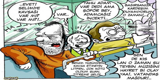 Kaptan nazlı nazlı sorunca kimseye dokunmaz bu soru. Herkes bir “essalamünaleyküm” dönüşüyle arkaya doğru bakar. Herkes arka dörtlüyle bir göz göze gelir. Arka dörtlü mahçup mahçup koro halinde “Biz öndekine verdik” der. Sonra silsile halinde, minübüs içindeki bütün o koca koca insanlar, birbirlerine nasıl verdiklerini ayan beyan itiraf ederler. O ana kadar henüz “vermemiş” olan aranan kişi, bu keşmekeş içerisinde ilk durakta çaktırmadan inerek canını zor kurtarır... -