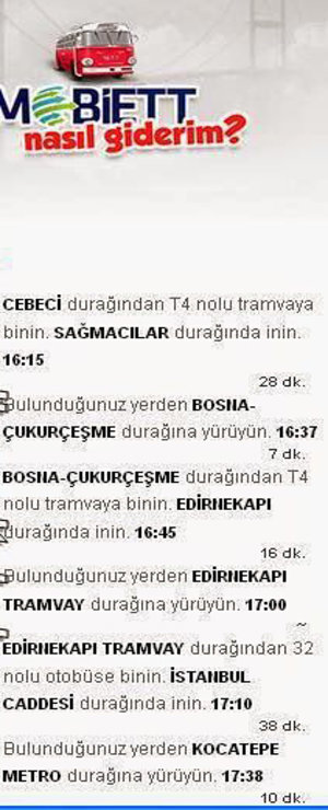 Bakın bir okuyucumuz, Sultangazi Cebeci Tramvay Durağı'ndan Bayrampaşa Kocatepe Metro Durağı'na gitmek için MOBİETT'ye girmiş. Normalde tek toplu taşıma aracıyla ve ardından da yürüyerek 45 dakikada gidilebilecek yol, MOBİETT'de 3 toplu taşıma aracıyla tarif edilmiş. Eğer yolcu, MOBİETT'nin tarifine uyarsa yaklaşık 100 dakikada gitmek istediği yere ulaşabiliyor.