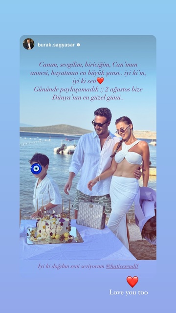 Burak Sağyaşar ise eşiyle olduğu bir fotoğrafı paylaşarak; "Canım sevgilim, biriciğim, Can'ımın annesi, hayatımın en büyük şansı... İyi ki sen. Gününde paylaşamadık ama 2 Ağustos bize dünyanın en güzel günü" notunu düştü.
