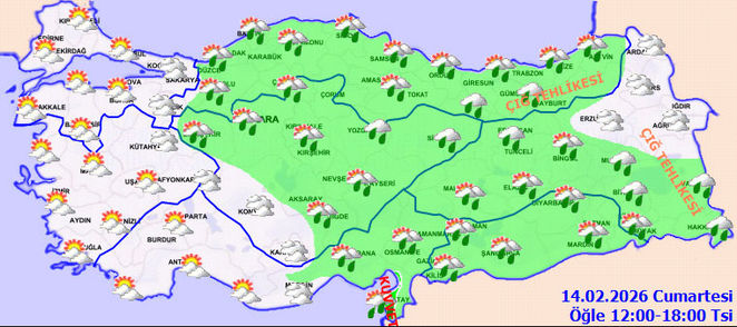 Yağışların, genellikle yağmur ve sağanak, Güney Ege ve Batı Akdeniz kıyılarında yer yer gök gürültülü sağanak, Doğu Anadolu’nun doğusunda (Iğdır ve Şırnak hariç) karla karışık yağmur ve kar şeklinde olması bekleniyor.