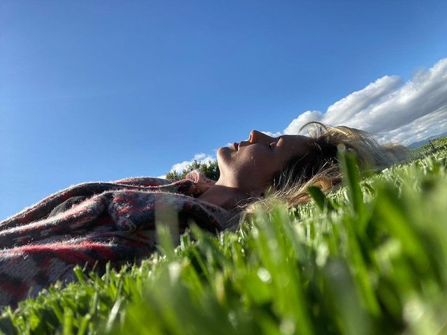 Çimlere yatarken çekilen karesini yayınlayan Heidi Klum, paylaşımına, "Evde 14. gün... Covid-19 negatif" düştü.