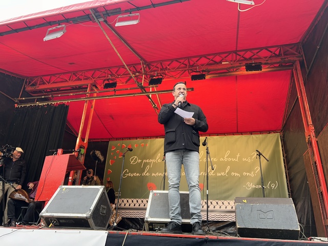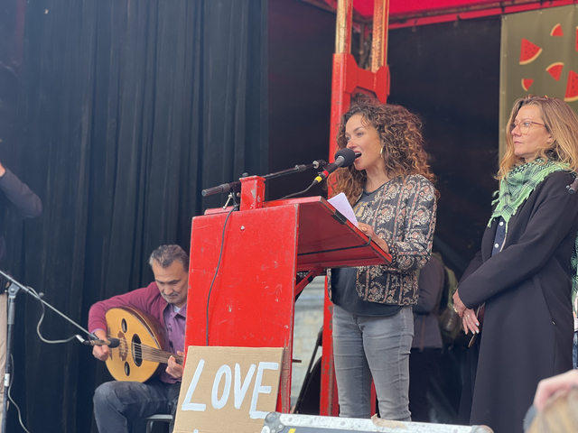 Hollandalı oyuncu Katja Schuurman, komedyen Najib Amhali, oyuncu Isa Hoes ve sunucu Fernando Halman, Filistinlilerle dayanışma için katıldıkları eylemde açıklamalarda bulundu.