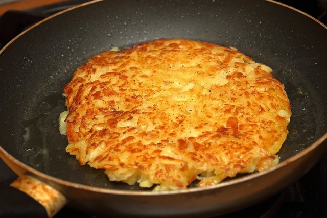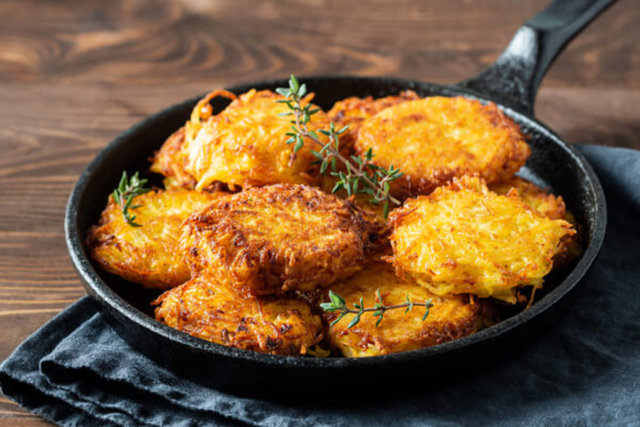İnce rendelenmiş patates ve soğanın kavrulmasıyla hazırlanıyor ve kızartıldığında altın rengini alıyor.