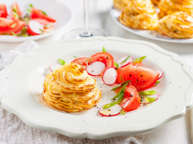 Sosyetik ve kibar görünen, aslında patates püresinin kuzeni olan bu tarif, son derece şık bir yemek. Fransızlar patates püresini yaparken yumurta sarısı, tereyağı, Hindistan cevizi kullanıyorlar ve pipetle sıkıyorlar. Sonrasında tereyağı sürülerek altın sarısına dönüşene kadar fırında pişiriyorlar. Düşes patatesleri, bir başka Fransız yemeği olan Pommes de TerreLorentte’nin temelidir ve Choux böreği hamuruyla pişirilir.