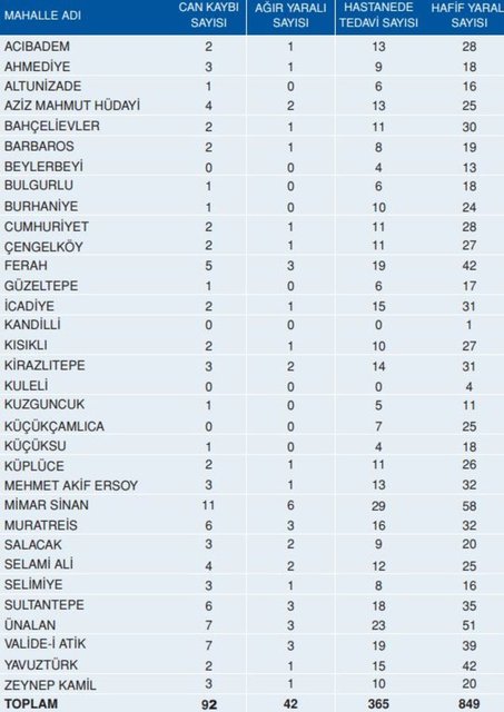 DEPREM SENARYOSUNA GÖRE ÜSKÜDAR İÇESİNDE OLASI CAN KAYBI VE YARALANMALAR