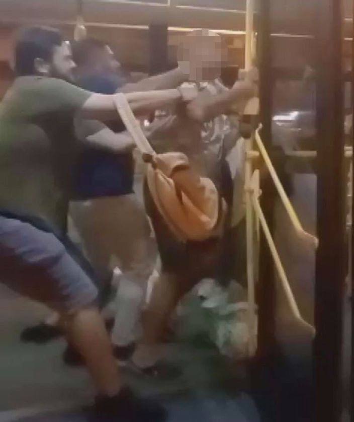 İddiaya göre tartıştığı bebekli kadını tartaklayan erkek yolcu, otobüstekiler tarafından yaka paça indirildi. O anları diğer yolcular cep telefonuyla kaydetti.
