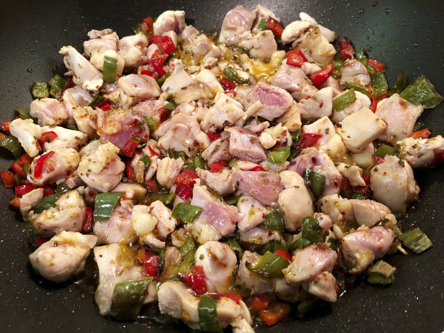 Tavuk etini kuşbaşı doğrayın. Soğanları yemeklik, biberleri julyen doğrayın, domatesleri de küp küp doğrayın.