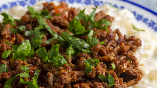 Piştikten sonra salça, toz kırmızı biber ve tuz ve sevdiğiniz diğer baharatları ekleyerek tatlandırın ve etinizi ocaktan alın. Közlenmiş patlıcanları kesme tahtasının üzerinde keskin bir bıçak yardımı ile iyice ezin. Patlıcanlarınızı ezme aşamasında üzerine hafifçe tuz atın. İyice ezildiklerinde yoğurtla bir kasenin içinde birleştirin ve güzelce karıştırın.