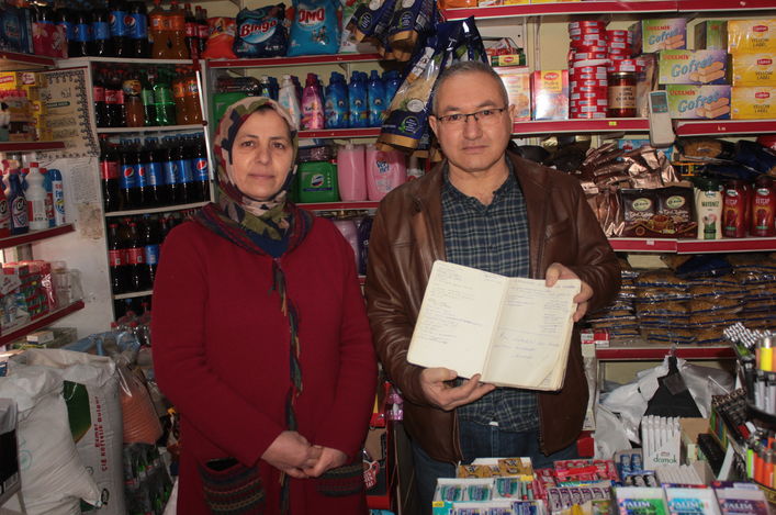 "Cuma namazından yarım saat önce 2 kişi gelip selam verdi. Bana, 'Bakkalda borcunu ödemekte zorlananlar, ödeyemeyenler var mı?' diye sordular. Ben de 'Var tabi, 5 senedir ödeyemeyip borcu olanlar da var' dedim. Onlar da 'Tamam, istediğimiz yere gelmişiz. Veresiye defterini çıkar da ödeyelim' dedi. Borcunu ödeyemeyenlerin borçlarını topladım, adamlar da parasını verip gitti. Hem ben çok memnun kaldım hem de alacaklı olduğum kişiler çok sevindiler. 'Allah sayılarınızı artırsın, çok güzel oldu. 6 senedir bakkallık yapıyorum daha böyle bir şey görmedim' dedim. Borcunu ödeyemeyen 13 kişinin toplam 5 bin lira tutan borcunu ödeyip gittiler. Bir aceleyle geldiler. İsimlerini sorunca da onemli değil. Çabuk ol başka yerlere de yetişeceğiz' dediler."