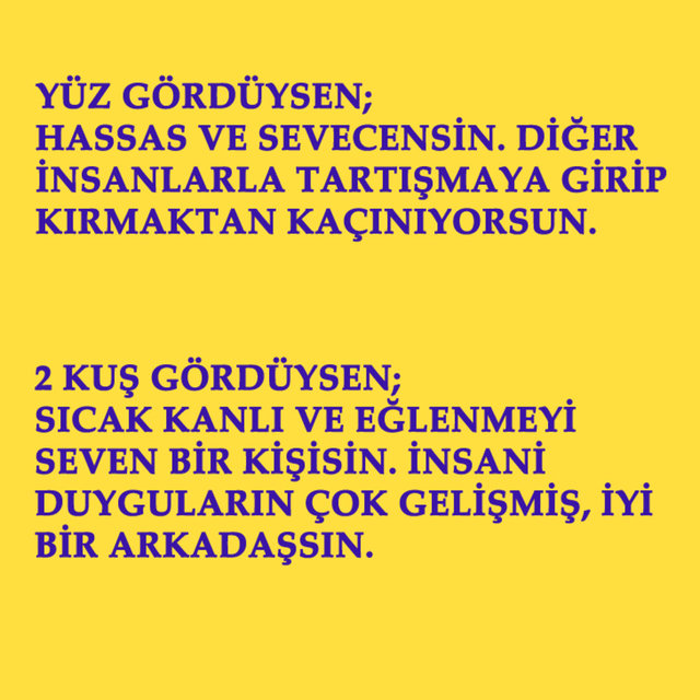 Bu soruda aslında bir doğru ya da yanlış yok. Görüş şeklimiz, kişilik özelliklerimizle ilgili ufak detayları ortaya çıkarıyor. Gördüğün hayvana göre kişilik özelliğini bulabilirsin.