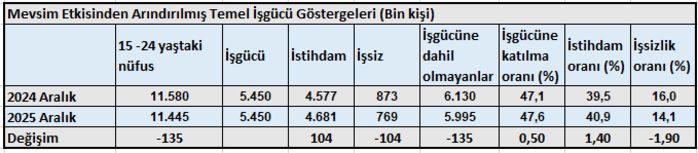 2025 yılında genç nüfus 135 bin kişi azalırken, istihdam 104 bin kişi artarak 4 milyon 577 binden 4 milyon 681 bin kişiye yükseldi. İşsiz sayısı ise 104 bin kişi azalarak 873 binden 769 bine geriledi. Genç nüfusta işgücüne katılma oranı 0,50 puan, istihdam oranı da 1,40 puan arttı. Bu sayede işsizlik oranı 1,90 puan azalarak yüzde 16,0’dan yüzde 14,1’e geriledi.