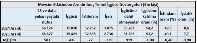 Geçen yıl aralık ayında 30 milyon 287 bin kişi olan işgücüne dahil olmayanların sayısı bu yıl 919 bin kişi artarak 31 milyon 206 bin oldu. Genel olarak 2025 yılının başından beri geçen yılın aynı ayının altında seyreden işgücüne katılma oranı aralık ayında da bu eğilimini sürdürdü. Geçen yılın aynı ayına göre 1 puan azalarak yüzde 53,2’ye geriledi. İstihdam oranı ise yüzde 49,5’ten yüzde 49,1’e düştü.