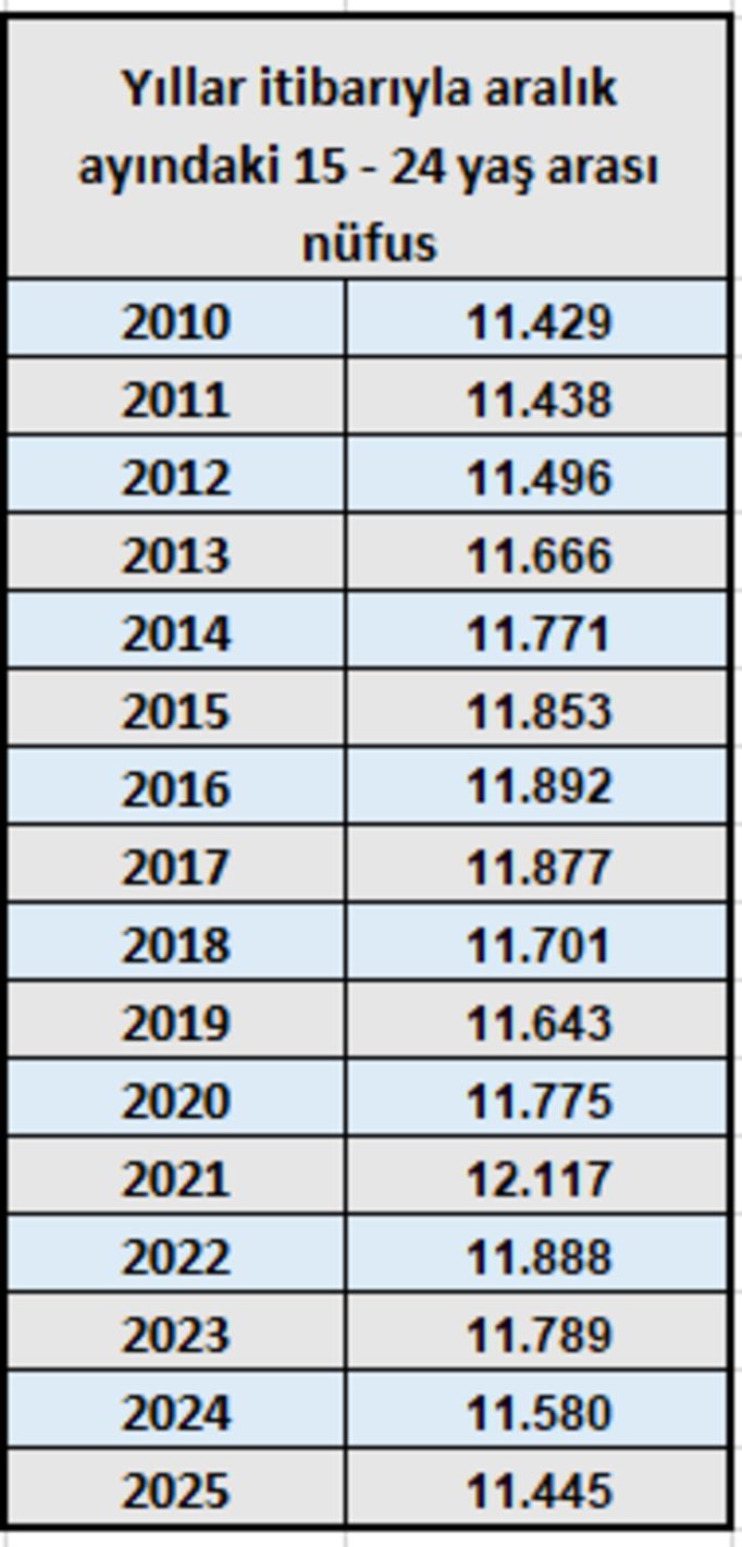 Çalışma çağındaki nüfusumuz her ne kadar şimdilik artmaya devam ediyorsa da 15-24 yaş arasındaki genç nüfus artışımız artmak bir yana azalıyor. 2021 yılında 12 milyon 117 bin kişi olan 15 – 24 yaş aralığındaki genç nüfus o tarihten beri hızla azalıyor. 2025 yılında bir önceki yıla göre 135 bin kişi azalarak 11 milyon 445 bin olan genç nüfus, 2012 yılındaki seviyenin altına gerilemiş bulunuyor.