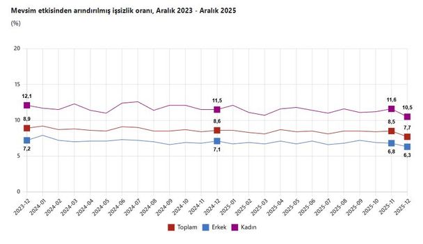 Aralık ayında işsizlik oranı bir önceki aya göre 0.8 puan düşerek yüzde 7.7'ye geriledi. Böylece mevsim etkilerinden arındırılmış işsizlik oranı veri setinin başlangıç tarihi olan Ocak 2005'ten bu yana en düşük seviyesine indi