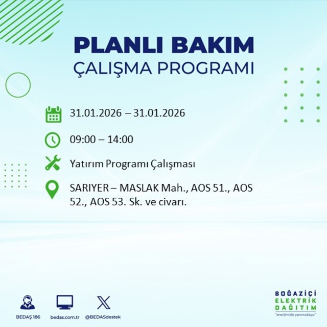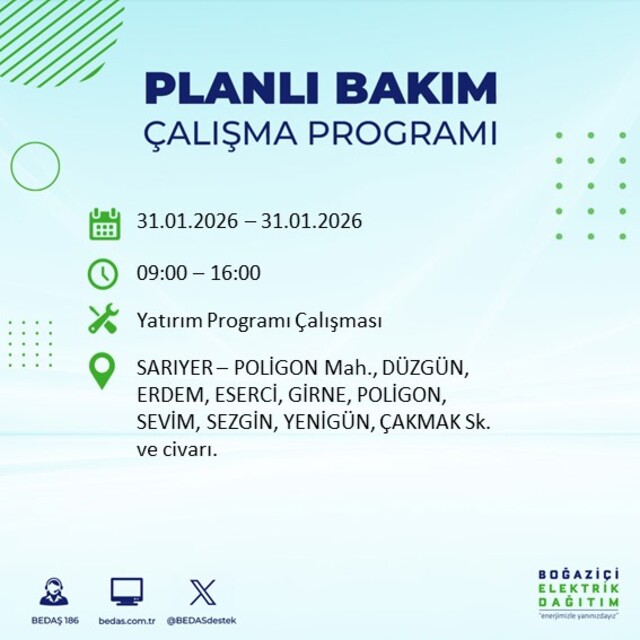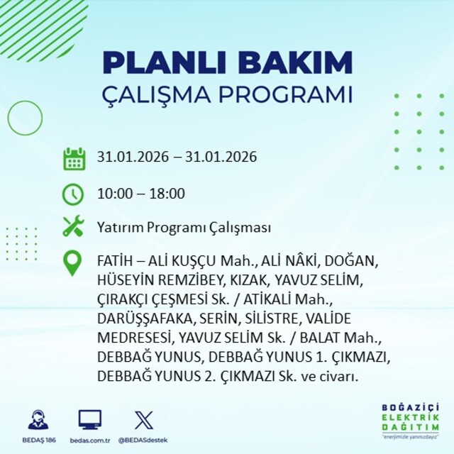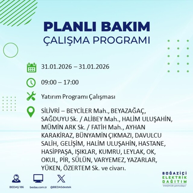 Boğaziçi Elektrik Dağıtım A.Ş tarafından yapılan açıklamaya göre, 31 Ocak Cumartesi günü İstanbul'da farklı saat aralıklarında büyük çaplı elektrik kesintileri uygulanacak. Kesintiler 16 ilçede etkili olacak.