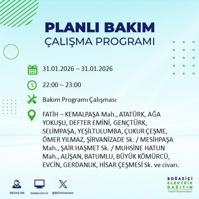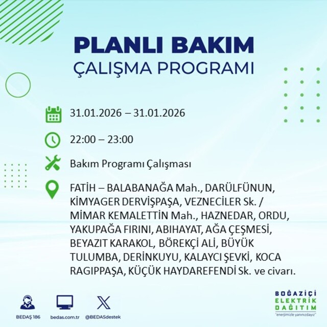 BEDA, 31 Ocak Cumartesi günü İstanbul'da 16 ilçede elektrik kesintisi yaşanacağını duyurdu. Yapılan duyuru sonucunda İstanbul'da mahalle mahalle hangi saat aralıklarda elektriklerin kesileceği belli oldu. Peki, 31 Ocak İstanbul'da elektrik kesintisi saat kaçta başlayacak ve elektrikler ne zaman gelecek? İşte İstanbul elektrik kesintisi duyuruları...