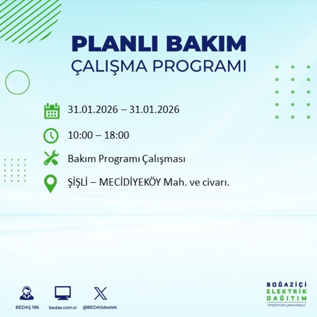 Boğaziçi Elektrik Dağıtım A.Ş (BEDAŞ), İstanbul'da 31 Ocak Cumartesi günü 16 ilçede elektrik kesintisi yaşanacağını duyurdu. Böylelikle kesinti yaşanacak ilçeler ve mahalleler belli oldu. Peki, elektrikler ne zaman gelecek, elektrik saat kaçta kesilecek? İşte 31 Ocak 2026 Cumartesi İstanbul'da elektrik kesintisi yaşanacak ilçeler...