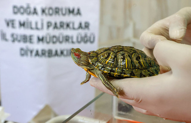 Diyarbakır'da, Dicle Nehri'nde vatandaşların bulduğu iki kırmızı yanaklı su kaplumbağası, Doğa Koruma ve Milli Parklar İl Müdürlüğü ekiplerine teslim edildi