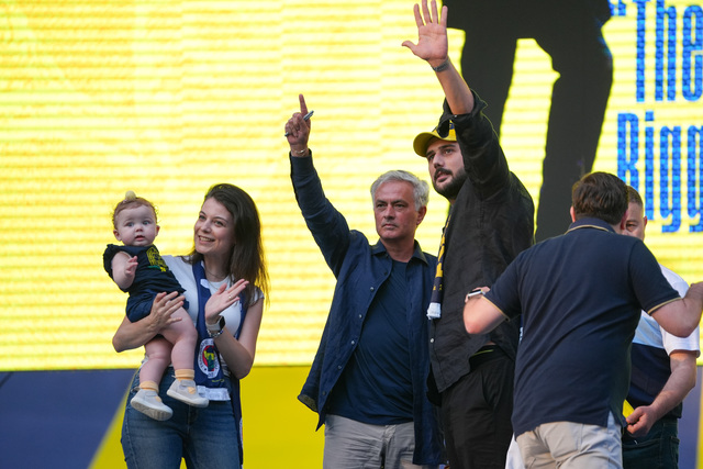 Sahaya kurulan büyük sahneye kulüp başkanı Ali Koç'la birlikte gelen Mourinho, imza töreni öncesinde tribünleri selamladı.