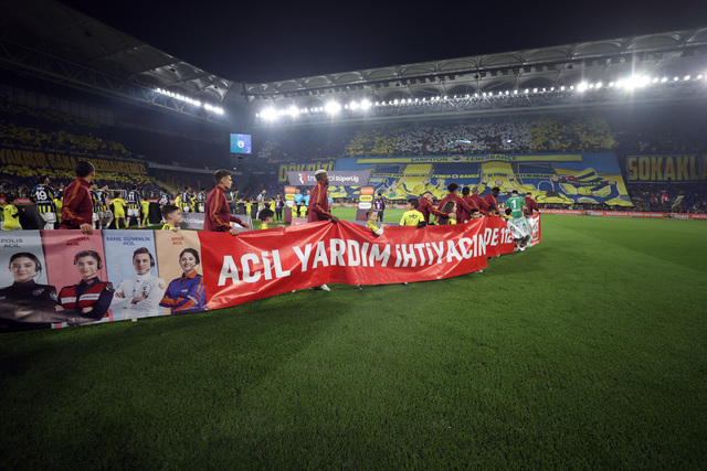 Çalınan marşlar ve tezahüratlarla derbi atmosferini yaşayan taraftarlar seremonide de hazırlanan koreografi ve pankartları açtılar.