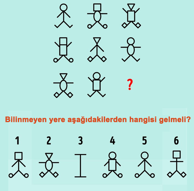 Her satırda kafa, gövde ve ayak ucunda şekil değişikliği oluyor. Bu durumda 3. satırda kare kafa, çizgi gövde ve yuvarlak ayak ucu eksik. 1. resim ile bu tamamlanıyor.