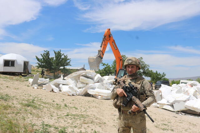 11 iglo ev ile 2 betonarme kaçak yapının yıkım çalışması sırasında jandarma personeli çevrede güvenlik önlemi aldı.