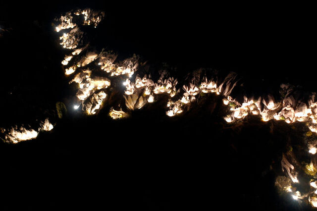 Nevşehir'in Uçhisar ile Göreme beldeleri arasında yer alan doğal kaya oluşumlarıyla kaplı Güvercinlik Vadisi'nde, Kültür ve Turizm Bakanlığınca başlatılan gece müzeciliği çerçevesinde Kapadokya Alan Başkanlığı tarafından aydınlatma çalışması yapıldı.
