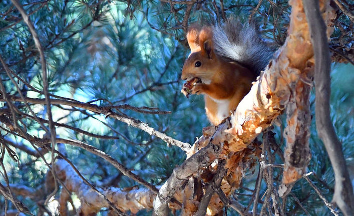 Güneşli havada yerleşim alanlarındaki ağaç dallarında gezinen ve kozalak kemiren kızıl sincaplar ile ağaçlarda gagalarıyla oyuklar açan ağaçkakanlar görüntülendi.