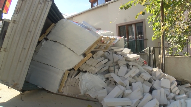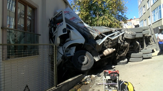Kartal'ın Hürriyet Mahallesi'nde Erol Ayvaz'ın kullandığı gaz beton yüklü kamyon, Kaya Sokak'ta yokuş aşağı indiği sırada şoförünün direksiyon hakimiyetini kaybetmesiyle önce yol kenarındaki elektrik direğine çarptı ardından da 2 katlı binaya girdi.