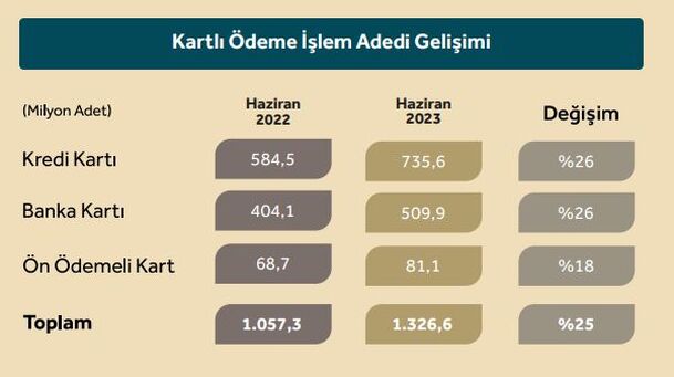 Kredi kartları, banka kartları ve ön ödemeli kartlar ile haziran ayında yapılan toplam ödeme adedi bir önceki yıla göre yüzde 25 artarak 1.3 milyar adet oldu.