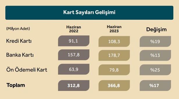 Bankalararası Kart Merkezi (BKM), haziran ayı verilerini açıkladı. Buna göre, haziran ayı itibarıyla Türkiye'de kredi kartı sayısı 108.3 milyon, banka kartı sayısı 178.7 milyon ve ön ödemeli kart sayısı 79.8 milyon adet oldu. Toplam kart sayısı geçen yılın haziran ayına göre yüzde 17 yükseldi.