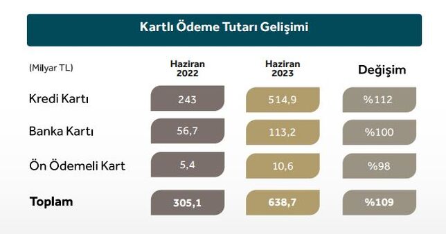 BKM verilerine göre haziran ayında kredi kartları, banka kartları ve ön ödemeli kartlar ile yapılan toplam ödeme tutarı bir önceki yılın aynı ayına göre yüzde 109 artarak 638.7 milyar TL'ye yükseldi.