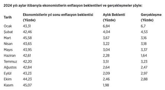 Ekonomistlerin kasım ayı enflasyon beklentilerinin ortalamasına göre (yüzde 1,98), bir önceki ay yüzde 48,58 olan yıllık enflasyonun yüzde 46,71'e ineceği öngörülüyor. Öte yandan, ekonomistlerin 2024 sonu enflasyon beklentisi kasımda yüzde 45,07 oldu. Tüketici Fiyat Endeksi, ekimde yüzde 2,88 artış kaydetmişti.