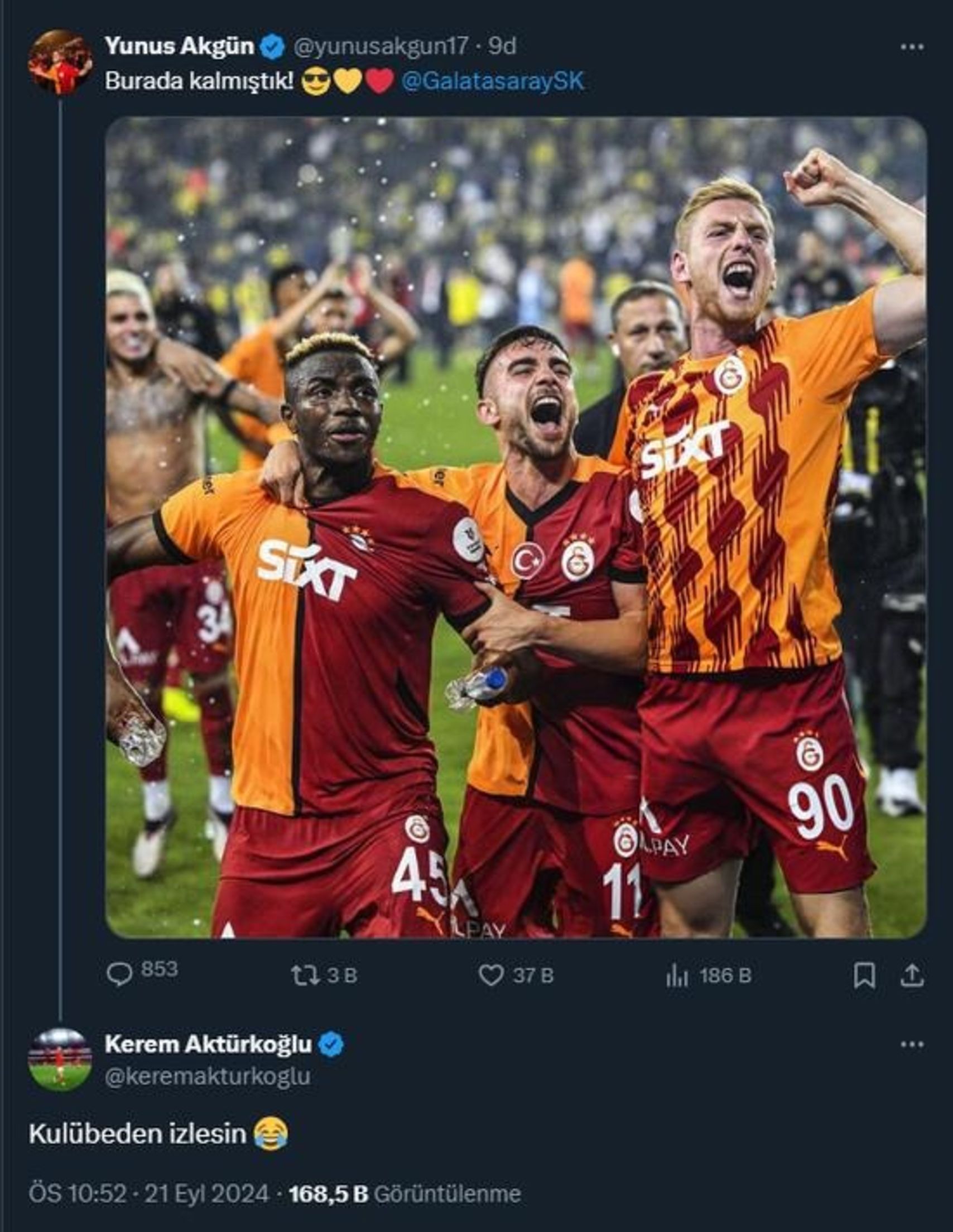 Geçen sezon Rams Park'ta oynanan maçın ardından Mert Hakan Yandaş ile tartışan Kerem Aktürkoğlu, maç sonunda Yunus Akgün'ün paylaşımına cevap verdi.