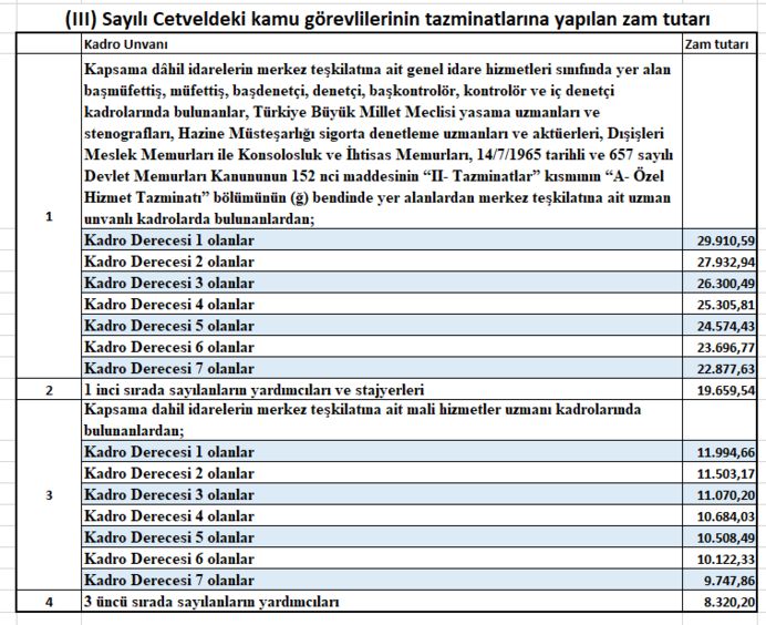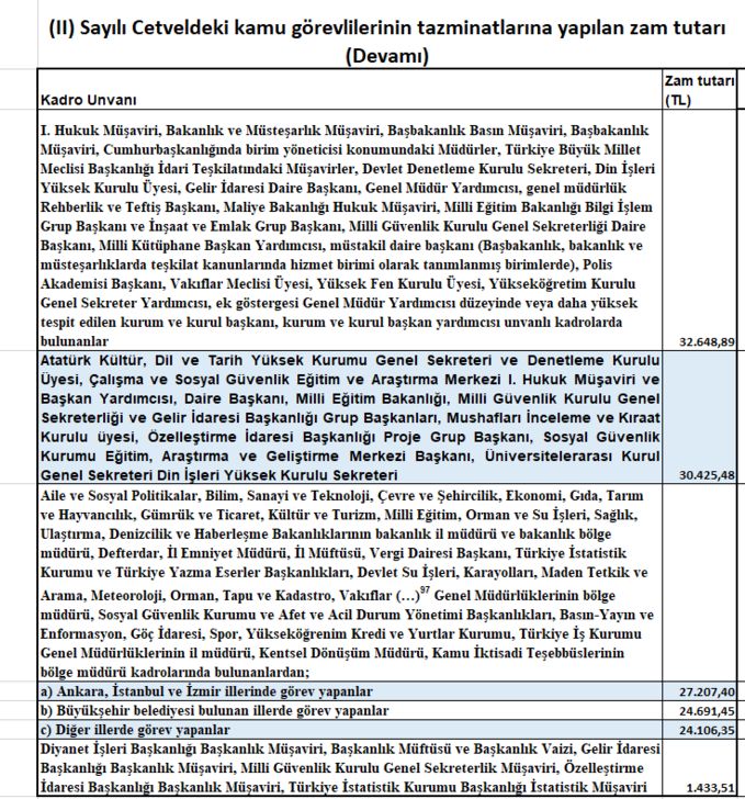 Daire başkanı, grup başkanı gibi pozisyondakilerin maaşlarında 30.425,48 TL, bakanlık müşaviri, genel müdür yardımcısı ve eşdeğeri pozisyondaki kamu görevlilerinin maaşlarında 32.648,89 TL artış yapıldı. Başbakan müşaviri, TBMM Başkan müşaviri ve eşdeğeri pozisyondakilere 32.180,80 TL, merkezde görev yapan büyükelçiler, çeşitli kurumların başkan ve başkan yardımcıları ile genel müdürlerine 34.521,22 TL, Devlet Personel Başkanı, Gelir İdaresi, Sosyal Güvenlik Kurumu, AFAD, Talim Terbiye Kurulu ve Türkiye İstatistik Kurumu başkanlarına 36.042,50 TL, bakanlık ve bağlı kuruluş müsteşarı, Devlet Denetleme Kurulu Başkanı, il valisi, MGK Genel Sekreteri, Özelleştirme İdaresi Başkanı ile ek göstergesi 7.800 ve daha yüksek kadrolarda bulunanlara 37.154,19 TL, Diyanet İşleri Başkanı ve TBMM Genel Sekreterine ise 38.382,92 TL zam yapıldı.