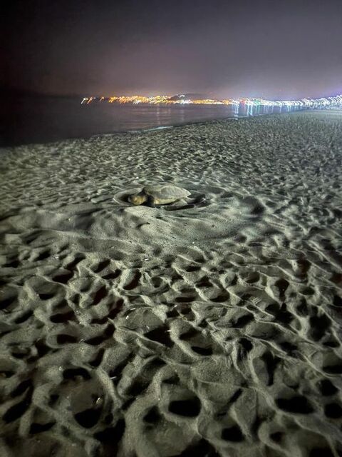 Kuşadası'nın Davutlar Mahallesi’nde bulunan Sevgi Plajı'na, önceki gün akşam saatlerinde çıkan bir caretta caretta yuva yapıp, yumurtalarını bıraktı.