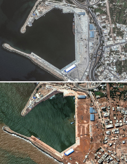 Derne'de bulunan iki barajın çökmesiyle sel suları şehrin merkezine indi, barajların yıkımından öncesi ve sonrası uydudan görüntülendi