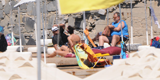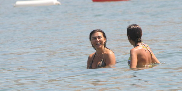 Görgüzel, denize girmeyen ve sıcak havada bunalan eşini, alnına buz sürerek ferahlatmaya çalıştı.