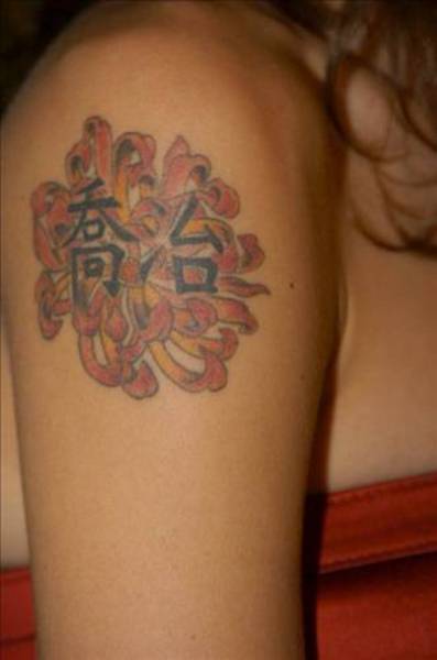 2003'te çift boşandıktan sonra Jolie bu dövmenin üzerine çocuklarının ve Brad Pitt'in doğduğu yerlerin koordinatlarını yazdırdı.
