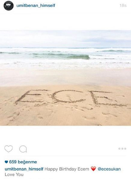 Ümit Benan, eski eşinin doğum gününü unutmadı. Kumlara 'Ece' yazan Benan bu fotoğrafı instagram'da paylaşıp altına da İngilizce olarak "Doğum günün kutlu olsun Ecem. Seni seviyorum" notu düştü.