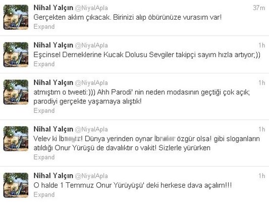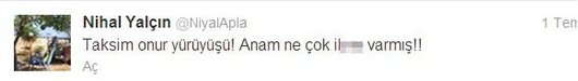 "Disco Kralı"nda Nahide Ekengil karakteriyle, sonra da "Yalan Dünya" dizisindeki Açılay karakteriyle tanınan Nihal Yalçın, Niyalapla adlı Twitter hesabından, 1 Temmuz günü Taksim'de yapılan Onur Yürüyüşü'yle ilgili bir yorum yapınca tepki aldı. Genç oyuncu, LGBT (lezbiyen, gey, biseksüel, transeksüel) hakları için 1 Temmuz'da yapılan 20. İstanbul LGBT Onur Haftası yürüyüşüyle ilgili olarak, "Taksim onur yürüyüşü! Anam ne çok i... varmış!" dedi. Twitter hesabından yazdığı tweet'le, başta geyler olmak üzere sosyal medyada çok sayıda eleştiri alan Yalçın'ın bu cümlesi yüzünden eşcinsel dernekleri, ünlü oyuncuya dava açmak için harekete geçti.