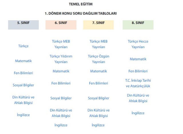 Türk Dili ve Edebiyatı, Matematik, Fen Bilimleri, Sosyal Bilgiler, Tarih, Coğrafya, Kimya, Fizik, Biyoloji, Din Kültürü ve Ahlak Bilgisi, İngilizce ve diğer derslerin konu dağılımları, tablolar üzerinden incelenebilecek.