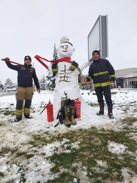 İHA'nın haberine göre 24 boyunca görevde olan itfaiye ekipleri, yağan karın ardından İtfaiye Müdürlüğü önüne kardan itfaiye eri yaptılar. İtfaiye eri giysisi ve kaskı takılan kardan adamı gören vatandaşlar, fotoğraf çektirerek anı ölümsüzleştirdiler.
