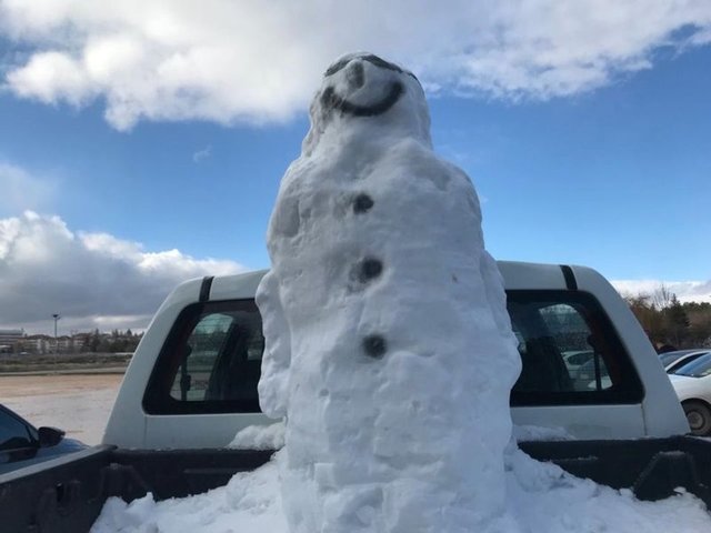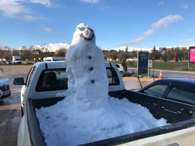 Eskişehir'de park halindeki kamyonetin kasasına yapılan gülümseyen kardan adam görenleri şaşırttı.