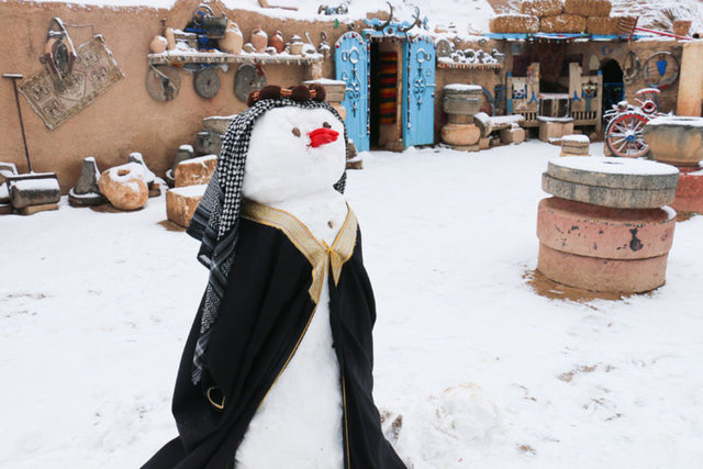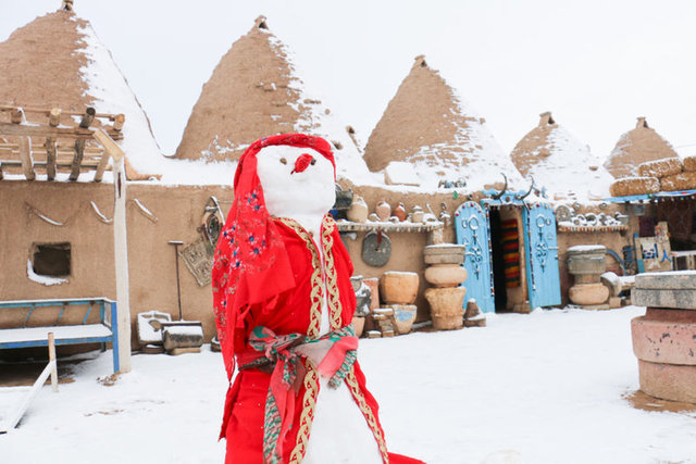 Şanlıurfa'nın Harran ilçesinde etkili olan kar yağışı, tarihi Konik Kubbeli Evleri beyaza bürüdü.