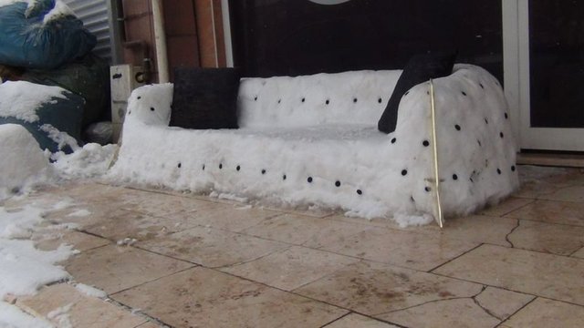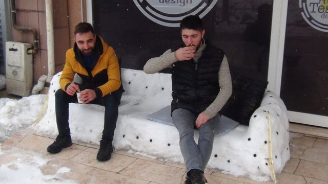 İHA'nın haberine göre mağaza çalışanları kaldırıma iki kişilik kardan koltuk yaptı.