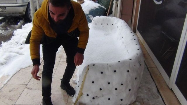 Ardından koltuğa oturup çay içti. Kaldırımda yürüyen vatandaşlar, kardan koltuğa oturup çay içenlere ilgiyle baktı.